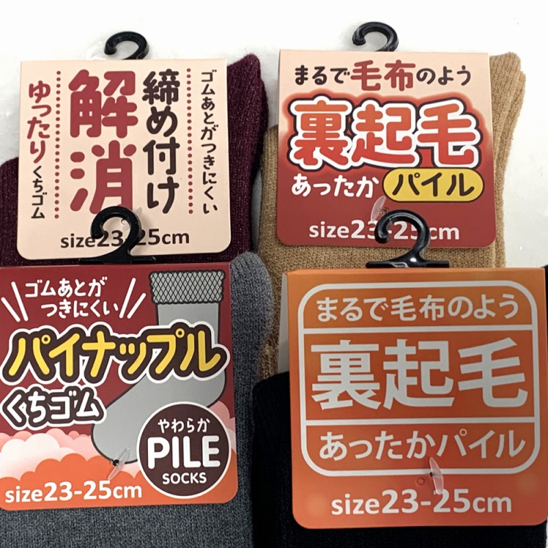 冬の売れ筋、裏起毛+パイル編みのダブルで暖かな靴下です。