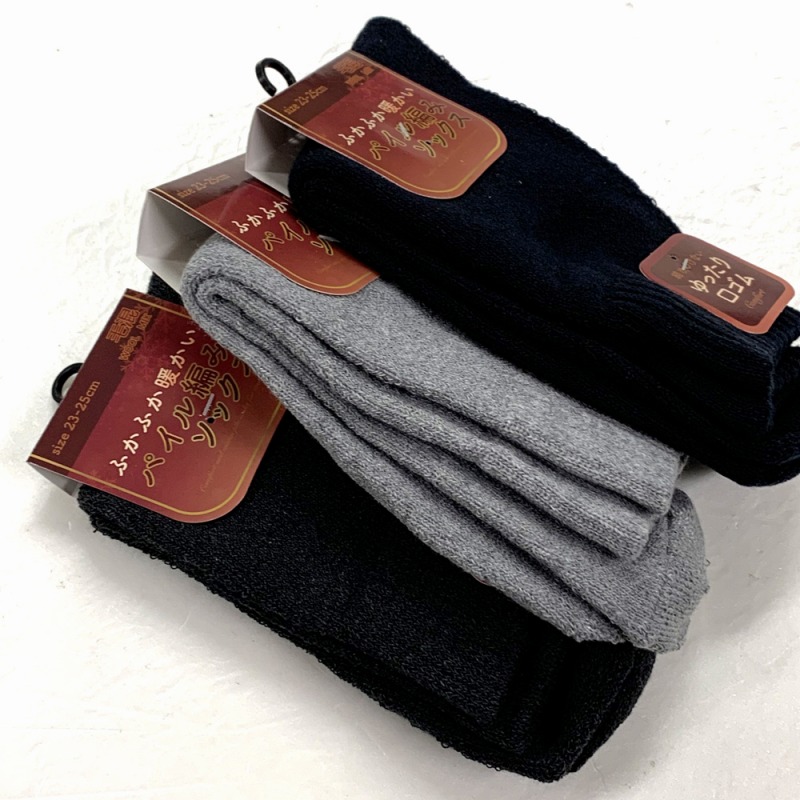 寒い時期には欠かせない、ウール混+パイル編みで、ダブルに抜群に暖かい靴下です。