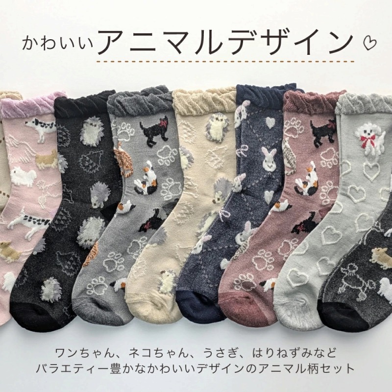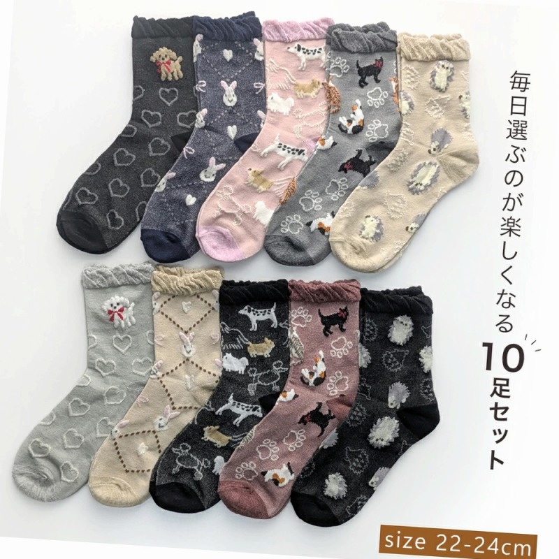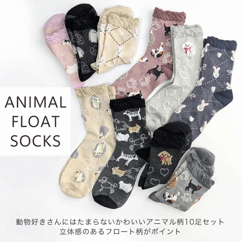 黒猫・プードル・ウサギ・犬・ハリネズミなど、人気の動物モチーフを集めたバラエティ豊富な10足セット。