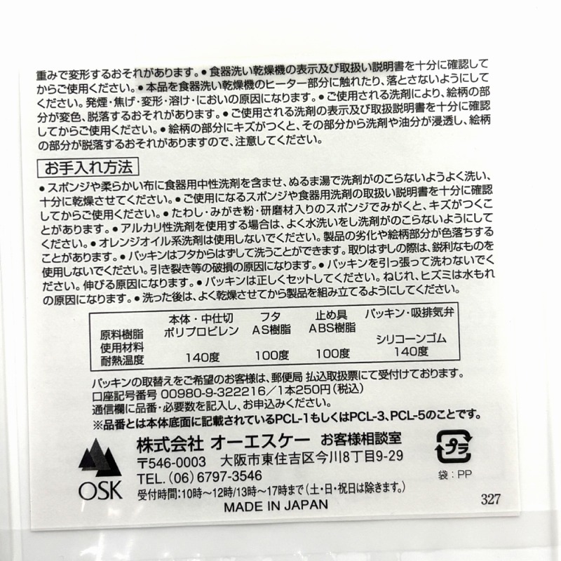| 素材 | 本体・仕切:PP フタ:AS、止め具:ABS パッキン・吸排気弁:シリコーンゴム ヘッダー付きOPP袋入り |